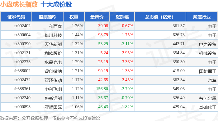 证券之星消息,12月24日,小盘成长(399376)指数报收于6215.92点,涨1.46%,成交1015.54亿元,换手率2.21%。当日该指数成份股中,上涨的有128家,兆驰股份以10.07%的涨幅领涨,下跌的有38家,旭升集团以4.12%的跌幅领跌。