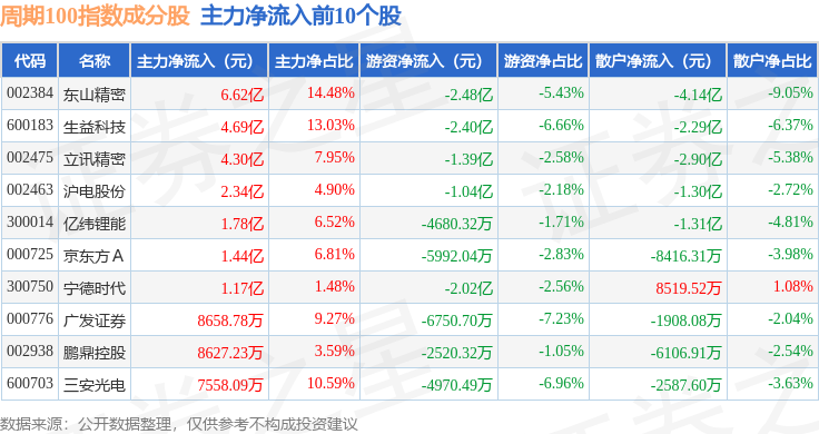 资金流向方面,周期100(399402)指数成份股当日主力资金净流出合计14.87亿元,游资资金净流出合计4.95亿元,散户资金净流入合计19.83亿元。成份股资金流向详情见下表: