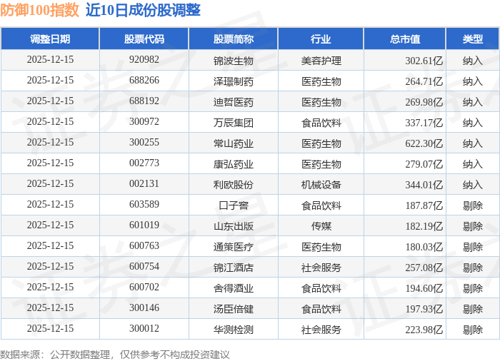近10日内防御100(399403)指数成份股做了调整,新纳入了7只股票,剔除了7只股票。