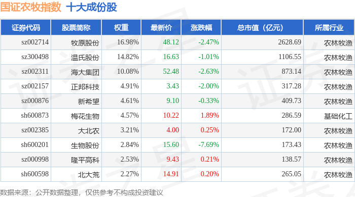 证券之星消息,12月24日,国证农牧(399435)指数报收于3991.81点,跌1.16%,成交148.73亿元,换手率2.45%。当日该指数成份股中,上涨的有19家,京基智农以4.49%的涨幅领涨,下跌的有18家,生物股份以7.69%的跌幅领跌。