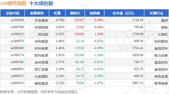 100绩效(399656)指数十大成份股详情如下: