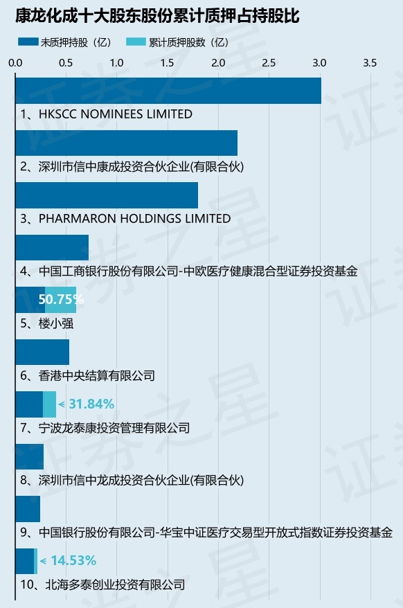 截止本公告日,股东楼小强已累计质押股份3072.4万股,占其持股总数的50.75%,股东宁波龙泰康投资管理有限公司已累计质押股份1278.0万股,占其持股总数的31.84%,股东北海多泰创业投资有限公司已累计质押股份319.0万股,占其持股总数的14.53%。本次质押后康龙化成十大股东的累计质押股份占持股比例(占持股比例的计算以公司最新一期财务报表公布的十大股东的持股总数为基准)见下图: