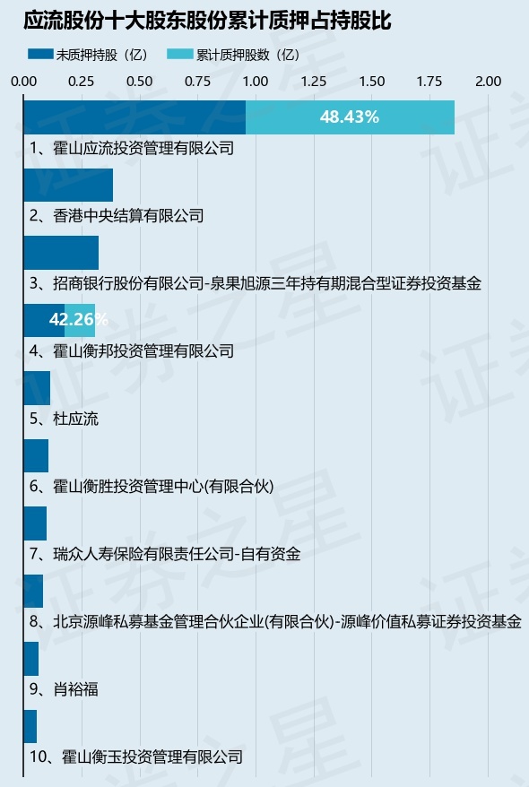 截止本公告日,股东霍山应流投资管理有限公司已累计质押股份9000.0万股,占其持股总数的48.43%,股东霍山衡邦投资管理有限公司已累计质押股份1300.0万股,占其持股总数的42.26%。本次质押后应流股份十大股东的累计质押股份占持股比例(占持股比例的计算以公司最新一期财务报表公布的十大股东的持股总数为基准)见下图: