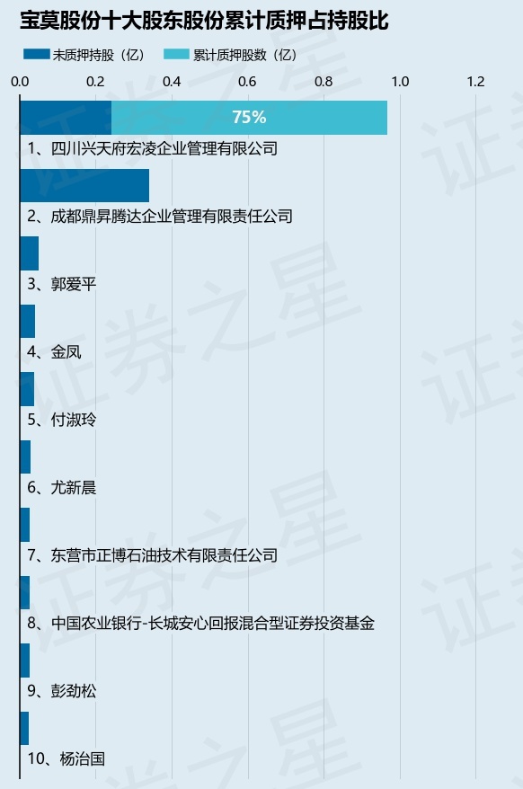 截止本公告日,股东四川兴天府宏凌企业管理有限公司已累计质押股份7252.0万股,占其持股总数的75.0%。本次质押后宝莫股份十大股东的累计质押股份占持股比例(占持股比例的计算以公司最新一期财务报表公布的十大股东的持股总数为基准)见下图: