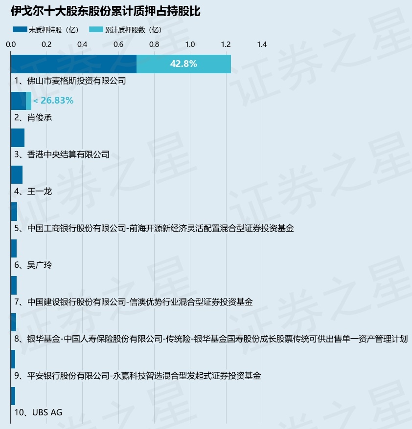 截止本公告日,股东佛山市麦格斯投资有限公司已累计质押股份5257.11万股,占其持股总数的42.8%,股东肖俊承已累计质押股份311.23万股,占其持股总数的26.83%。本次质押后伊戈尔十大股东的累计质押股份占持股比例(占持股比例的计算以公司最新一期财务报表公布的十大股东的持股总数为基准)见下图: