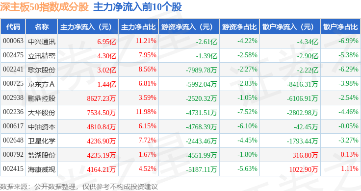 资金流向方面,深主板50(399750)指数成份股当日主力资金净流出合计8068.83万元,游资资金净流出合计1.9亿元,散户资金净流入合计2.71亿元。成份股资金流向详情见下表: