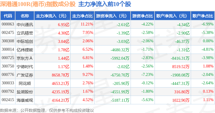 资金流向方面,深港通100R(港币)(483008)指数成份股当日主力资金净流出合计18.49亿元,游资资金净流入合计6.07亿元,散户资金净流入合计12.42亿元。成份股资金流向详情见下表: