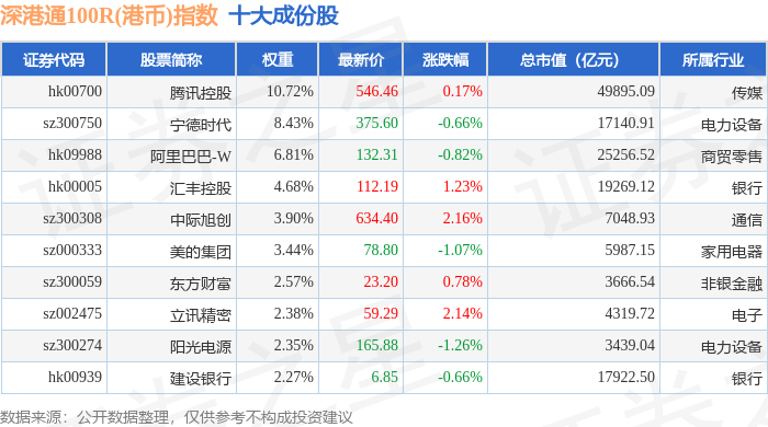 深港通100R(港币)(483008)指数十大成份股详情如下: