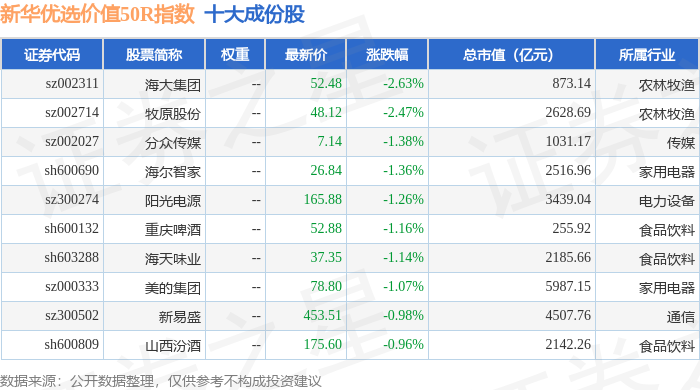 新华优选价值50R(489004)指数十大成份股详情如下: