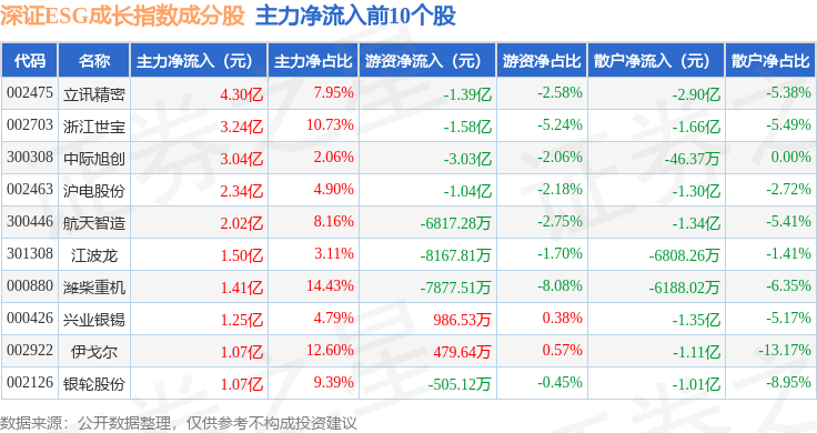 资金流向方面,深证ESG成长(970060)指数成份股当日主力资金净流入合计1.62亿元,游资资金净流出合计4.85亿元,散户资金净流入合计3.23亿元。成份股资金流向详情见下表: