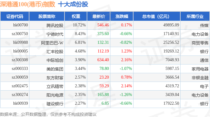 深港通100(港币)(983008)指数十大成份股详情如下: