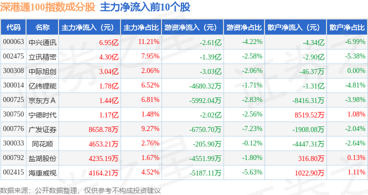 资金流向方面,深港通100(983007)指数成份股当日主力资金净流出合计18.49亿元,游资资金净流入合计6.07亿元,散户资金净流入合计12.42亿元。成份股资金流向详情见下表: