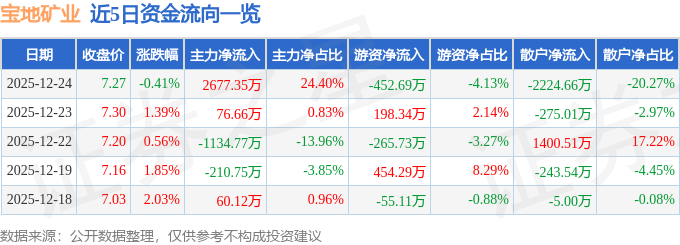 证券之星消息,截至2025年12月24日收盘,宝地矿业(601121)报收于7.27元,下跌0.41%,换手率3.98%,成交量15.12万手,成交额1.1亿元。