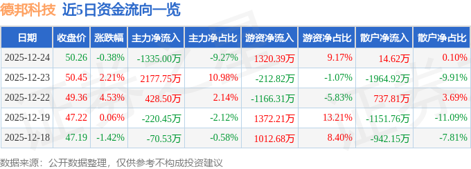证券之星消息,截至2025年12月24日收盘,德邦科技(688035)报收于50.26元,下跌0.38%,换手率2.02%,成交量2.88万手,成交额1.44亿元。