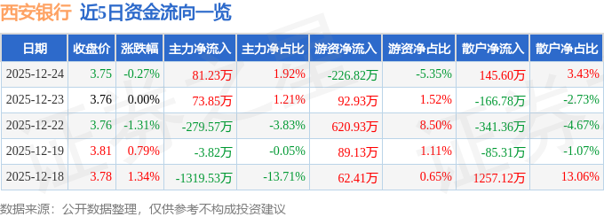 证券之星消息,截至2025年12月24日收盘,西安银行(600928)报收于3.75元,下跌0.27%,换手率0.26%,成交量11.31万手,成交额4239.82万元。