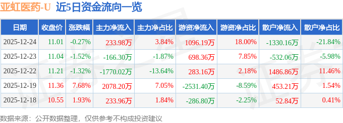 证券之星消息,截至2025年12月24日收盘,亚虹医药(688176)报收于11.01元,下跌0.27%,换手率1.27%,成交量5.52万手,成交额6089.21万元。