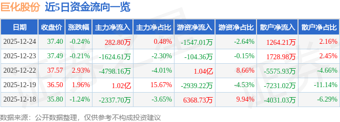 证券之星消息,截至2025年12月24日收盘,巨化股份(600160)报收于37.4元,下跌0.24%,换手率0.58%,成交量15.66万手,成交额5.86亿元。