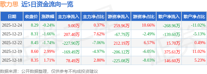 证券之星消息,截至2025年12月24日收盘,歌力思(603808)报收于8.29元,下跌0.24%,换手率0.8%,成交量2.95万手,成交额2439.79万元。