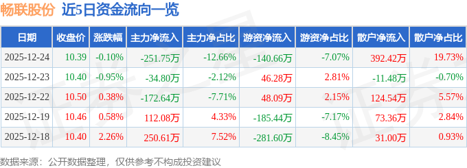 证券之星消息,截至2025年12月24日收盘,畅联股份(603648)报收于10.39元,下跌0.1%,换手率0.53%,成交量1.91万手,成交额1988.7万元。