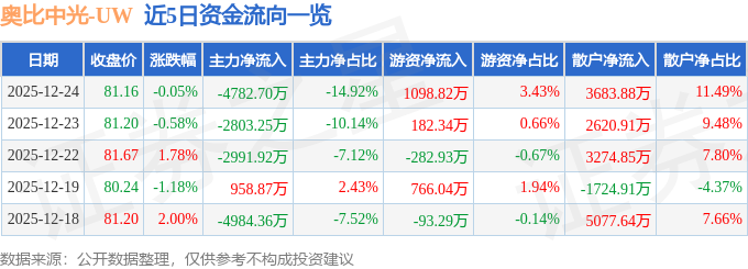 证券之星消息,截至2025年12月24日收盘,奥比中光(688322)报收于81.16元,下跌0.05%,换手率1.35%,成交量3.94万手,成交额3.21亿元。