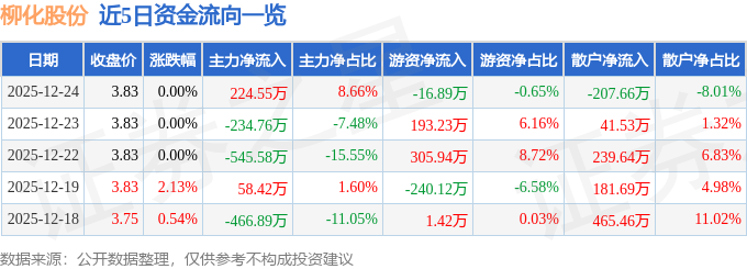 证券之星消息,截至2025年12月24日收盘,柳化股份(600423)报收于3.83元,上涨0.0%,换手率0.85%,成交量6.79万手,成交额2593.86万元。