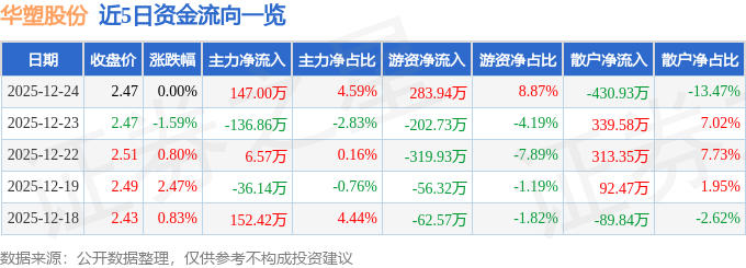 证券之星消息,截至2025年12月24日收盘,华塑股份(600935)报收于2.47元,上涨0.0%,换手率0.37%,成交量12.97万手,成交额3199.64万元。
