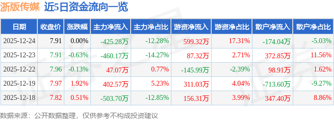 证券之星消息,截至2025年12月24日收盘,浙版传媒(601921)报收于7.91元,上涨0.0%,换手率0.2%,成交量4.38万手,成交额3461.89万元。