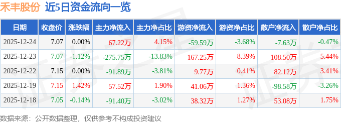 证券之星消息,截至2025年12月24日收盘,禾丰股份(603609)报收于7.07元,上涨0.0%,换手率0.25%,成交量2.29万手,成交额1618.63万元。