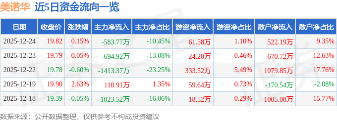 证券之星消息,截至2025年12月24日收盘,美诺华(603538)报收于19.82元,上涨0.15%,换手率1.31%,成交量2.82万手,成交额5587.3万元。