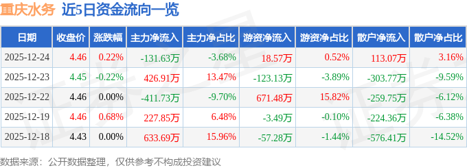 证券之星消息,截至2025年12月24日收盘,重庆水务(601158)报收于4.46元,上涨0.22%,换手率0.17%,成交量8.04万手,成交额3580.91万元。
