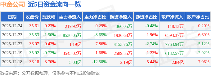 证券之星消息,截至2025年12月24日收盘,中金公司(601995)报收于35.61元,上涨0.23%,换手率0.73%,成交量21.33万手,成交额7.59亿元。