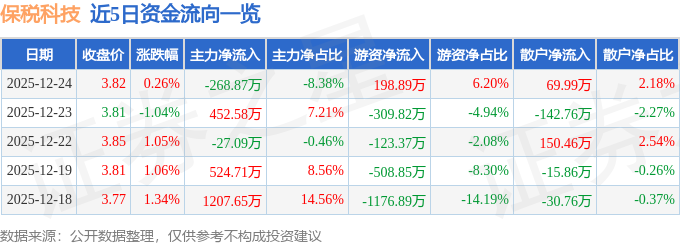 证券之星消息,截至2025年12月24日收盘,保税科技(600794)报收于3.82元,上涨0.26%,换手率0.7%,成交量8.4万手,成交额3209.14万元。
