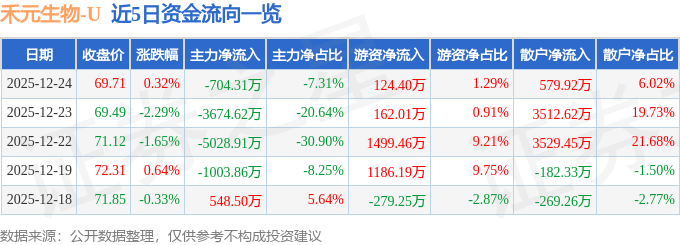 证券之星消息,截至2025年12月24日收盘,禾元生物(688765)报收于69.71元,上涨0.32%,换手率3.38%,成交量1.39万手,成交额9638.78万元。
