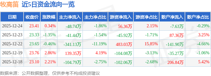 证券之星消息,截至2025年12月24日收盘,牧高笛(603908)报收于23.41元,上涨0.34%,换手率1.2%,成交量1.12万手,成交额2616.36万元。