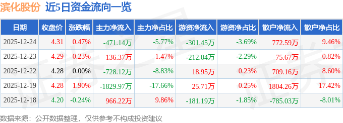 证券之星消息,截至2025年12月24日收盘,滨化股份(601678)报收于4.31元,上涨0.47%,换手率0.93%,成交量19.02万手,成交额8170.68万元。