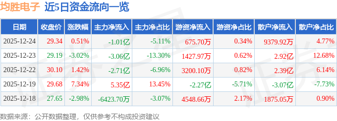 证券之星消息,截至2025年12月24日收盘,均胜电子(600699)报收于29.34元,上涨0.51%,换手率4.94%,成交量66.89万手,成交额19.68亿元。