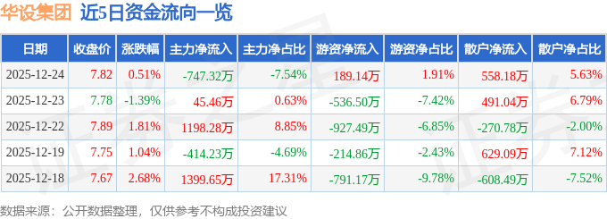 证券之星消息,截至2025年12月24日收盘,华设集团(603018)报收于7.82元,上涨0.51%,换手率1.87%,成交量12.81万手,成交额9911.84万元。