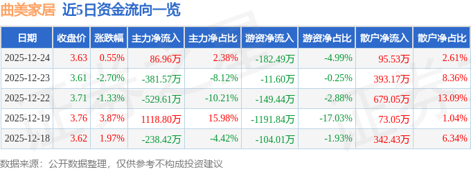 证券之星消息,截至2025年12月24日收盘,曲美家居(603818)报收于3.63元,上涨0.55%,换手率1.47%,成交量10.09万手,成交额3655.38万元。