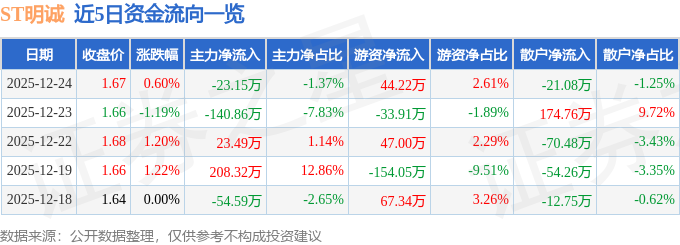 证券之星消息,截至2025年12月24日收盘,ST明诚(600136)报收于1.67元,上涨0.6%,换手率0.52%,成交量10.19万手,成交额1691.89万元。