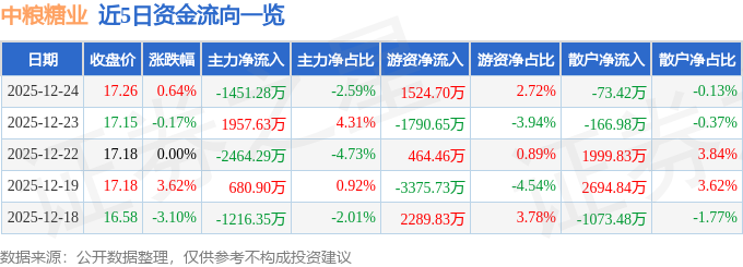 证券之星消息,截至2025年12月24日收盘,中粮糖业(600737)报收于17.26元,上涨0.64%,换手率1.52%,成交量32.45万手,成交额5.61亿元。