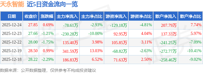 证券之星消息,截至2025年12月24日收盘,天永智能(603895)报收于27.85元,上涨0.69%,换手率0.89%,成交量9630.0手,成交额2684.4万元。