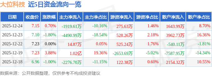 证券之星消息,截至2025年12月24日收盘,大位科技(600589)报收于7.15元,上涨0.7%,换手率1.79%,成交量26.45万手,成交额1.89亿元。