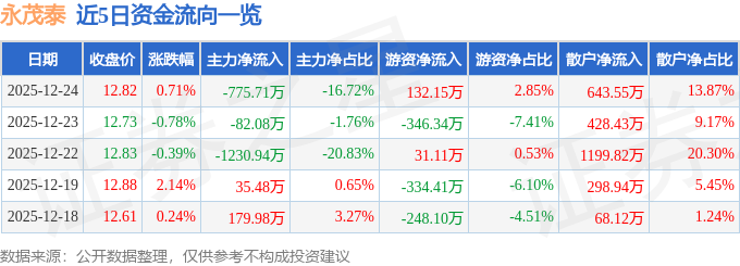 证券之星消息,截至2025年12月24日收盘,永茂泰(605208)报收于12.82元,上涨0.71%,换手率1.1%,成交量3.63万手,成交额4638.78万元。