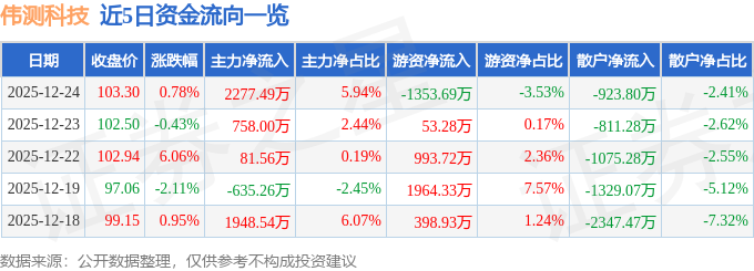 证券之星消息,截至2025年12月24日收盘,伟测科技(688372)报收于103.3元,上涨0.78%,换手率2.5%,成交量3.72万手,成交额3.84亿元。