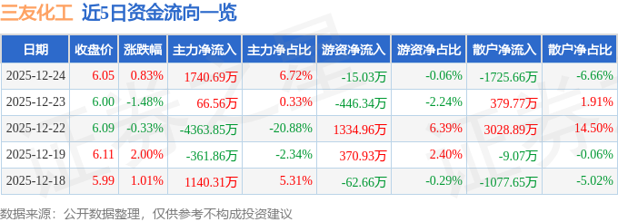 证券之星消息,截至2025年12月24日收盘,三友化工(600409)报收于6.05元,上涨0.83%,换手率2.1%,成交量43.27万手,成交额2.59亿元。