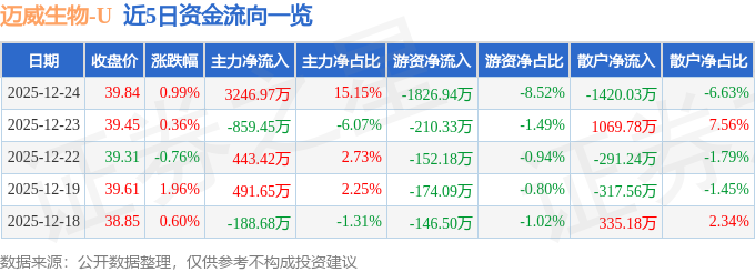 证券之星消息,截至2025年12月24日收盘,迈威生物(688062)报收于39.84元,上涨0.99%,换手率2.63%,成交量5.36万手,成交额2.14亿元。