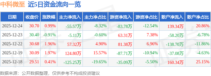 证券之星消息,截至2025年12月24日收盘,中科微至(688211)报收于30.7元,上涨0.99%,换手率0.17%,成交量2182.0手,成交额667.87万元。