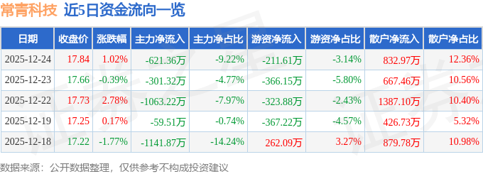 证券之星消息,截至2025年12月24日收盘,常青科技(603125)报收于17.84元,上涨1.02%,换手率3.75%,成交量3.8万手,成交额6739.95万元。