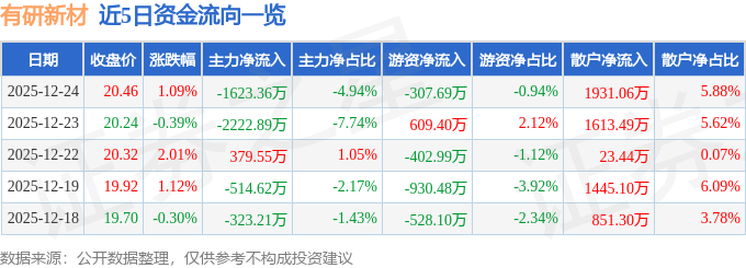 12月24日的资金流向数据方面,主力资金净流出1623.36万元,占总成交额4.94%,游资资金净流出307.69万元,占总成交额0.94%,散户资金净流入1931.06万元,占总成交额5.88%。