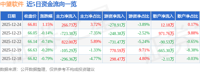 证券之星消息,截至2025年12月24日收盘,中望软件(688083)报收于66.81元,上涨1.15%,换手率0.63%,成交量1.08万手,成交额7161.27万元。